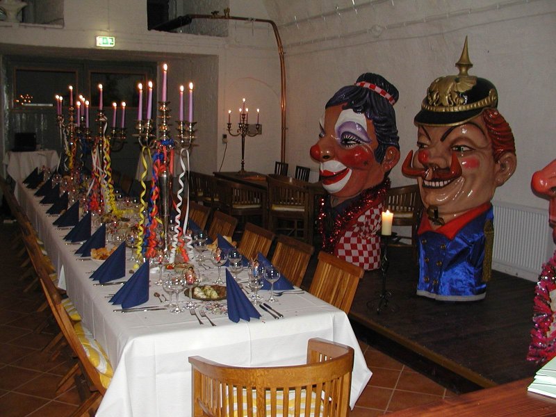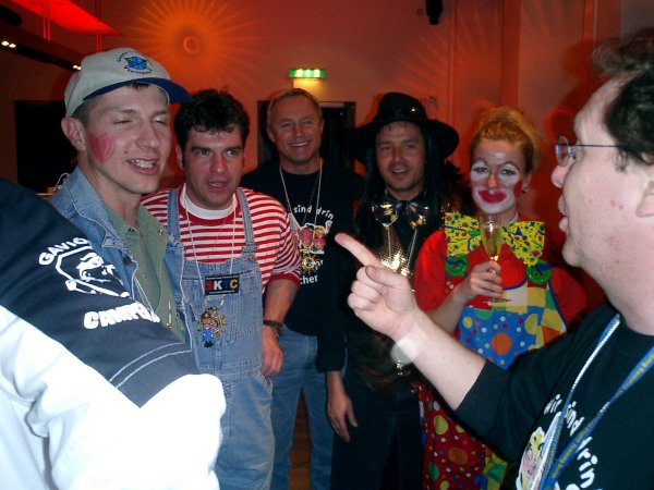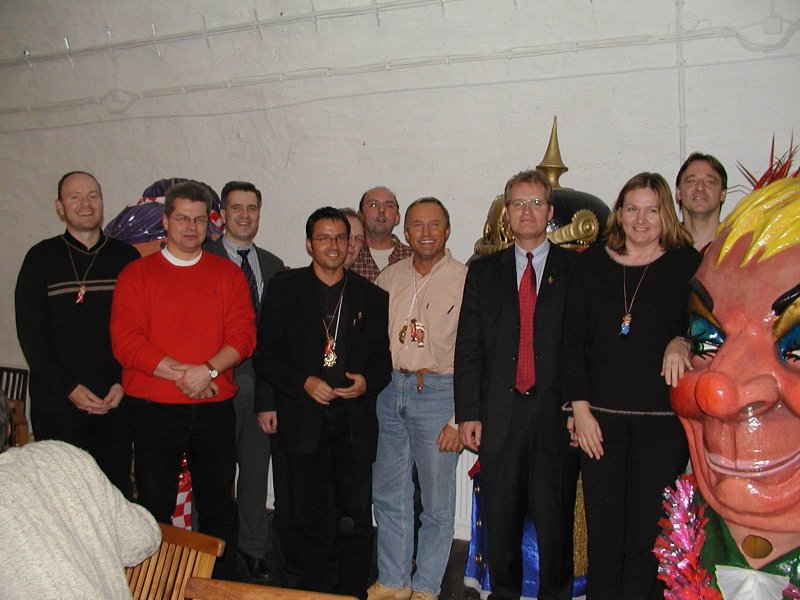 An diesem Tag wurde auch die Oma von Stefan Fredrich als ältestes Mitglied aufgenommen. Die rüstige Dame ist immerhin 96 Jahre jung und wurde von Rührung übermannt, als alle 29 Schwellköpp ihr die Ehre erwiesen.Kurz bevor die Rekruten sich zur Verteidigung versammelten, stellte Buddy Becker seinen "Schwellkopp-Reggae" vor. Die karibischen Klänge erfassten die Schwellköpp, die sich ganz dem Rythmus hingaben und ihrer Tanzfreude freien Lauf ließen. Von wegen Karneval in Rio, hier in Meenz geht es auch heiß her!
