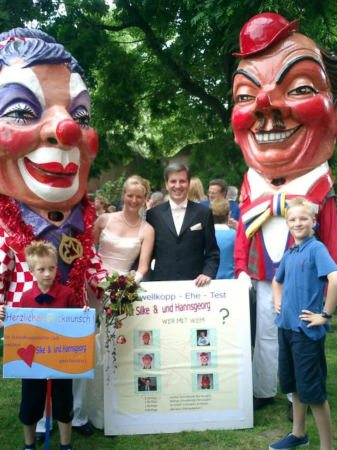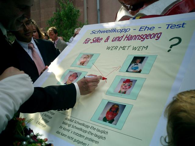 Die ursprüngliche Idee, Braut und Bräutigam auf eine Ehrenrunde im Schwellkopp um die Peterskirche zu schicken, wurde mit Rücksicht auf das hochzeitliche Outfit und die hochsommerlichen Temperaturen fallen gelassen. Stattdessen mußten die Jungvermählten den gnadenlosen Schwellkopp-Ehe-Test bestehen.