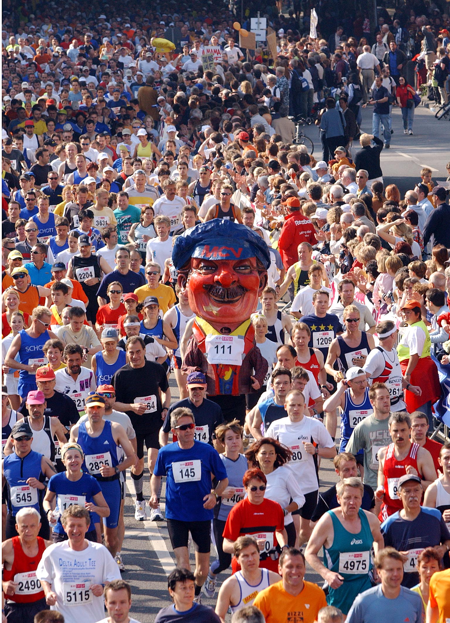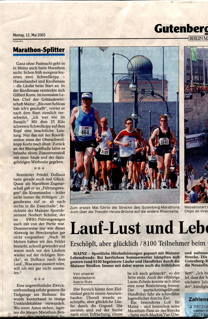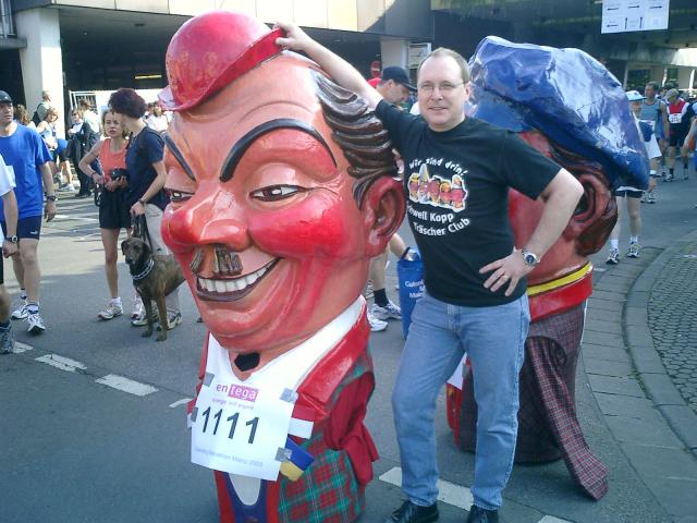 Für ein ganz besonderes Lokalkolorit beim diesjährigen Gutenberg-Marathon sorgten die zwei Schwellköpp Hannebambel und Knollenas. Getragen von Wolfgang Helm und Gilbert Korte schickten sie am Start die fast 8000 Läufer auf den Kurs. Kurzentschlossen nahmen beide ein Bad in der begeisterten Läufermenge und machten sich selbst auf den Weg. Gilbert kam, getragen von den ermutigenden Zurufen der Zuschauer bzw. der ihn überholenden Läufer, immerhin bis auf die Höhe des Kurfürstlichen Schlosses.